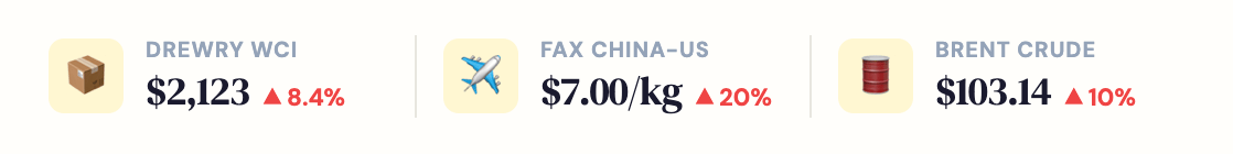 Starting this week, every edition opens with three numbers that tell you where the market moved. Two are fixed: WCI (global container rates) and FAX (air cargo rates). The third rotates based on whatever's driving the biggest story that week. Think of it as your Monday morning dashboard.