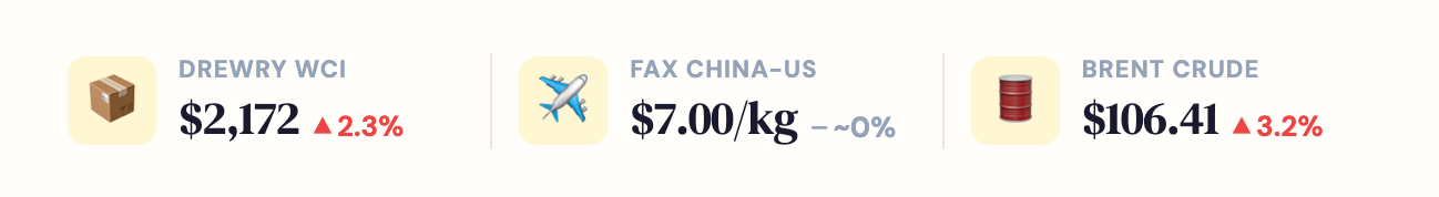 Container rates up for a third straight week as carriers stack emergency fuel surcharges on top of GRIs. Air cargo easing slightly as UAE reopens corridors, Qatar still offline. Brent closed Friday at $106.41, and continued to climb over the weekend, heading into Trump's 48-hour Hormuz deadline. Monday night determines what Tuesday morning costs.